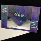 A beautiful large card featuring a cut out heart that swings freely in a frame. Tell someone you love them. Choose a sentiment for the left side, place the name on the swinging heart and choose another sentiment on the right.
