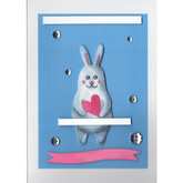 This cute grey cartoon style bunny holds a heart in his hand and is raised up on a blue background. The eyes, cheeks and nose are hand embellished to make them pop and for a little bit of sparkly goodness there are large iridescent clear gems.