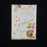 Two cute birds standing on a birdhouse with their eyes closed singing. The default sentiment is "You're the tweetest Valentine I ever did see! Musical notes and flowers are scattered in the background.